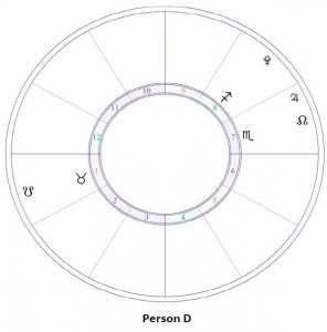 (P) Mislim da razumem, ali želim da budem siguran. U mom primeru imam Jupitera (vladara Plutonovog znaka) u istoj kući kao i Severni Čvor, u Škorpionu koji je znak Plutonovog prirodnog vladarstva. Ukoliko bi ,umesto toga, bio, recimo, u Devici u 5. kući, da li bi potraga (Jupiter) u vezi sa razlozima koji se vrše kroz Plutona u Strelcu u 8. Kući, bila više usmerena na razumevanje psihologije osećanja duboke praznine, do koje dolazi zbog osećaja nemanja životne svrhe? Da li bi to bio jedan od tokova(Osoba E)? Još uvek bi postojala potreba da se izaƋe iz čaure (Južni Čvor u Biku u 1. kući/Severni Čvor u Vagi u 7. kući). Da li bi Jupiter/Devica/5. kuća obojili prirodu čaure (Južni Čvor) samo zato što vlada znakom u kojem se nalazi Pluton?